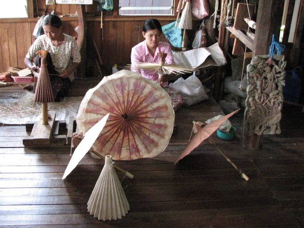 Besonders beeindruckt hat uns die Fertigung von Pergament-Schirmen. Zuerst stellen die Frauen dort das Pergament aus geriebenem und aufgelöstem Bambus her. Zwischen zwei Schichten Bambuspapier kommen dann getrocknete Blumen. In mühevoller Kleinarbeit wird dann aus Bambus ein Schirm-Gestell gefertigt (das man auch zuklappen kann) und mit dem Pergament bezogen. Immer wieder erschüttert uns die Tatsache, dass menschliche Arbeitskraft hier nicht verrechnet wird, nur das Material zählt. So kostet z.B. ein aufwändig hergestellter Schirm genauso viel wie ein simples Notizbuch mit Pergament-Seiten; obwohl der Aufwand, einen Schirm herzustellen, ein Vielfacher ist ....