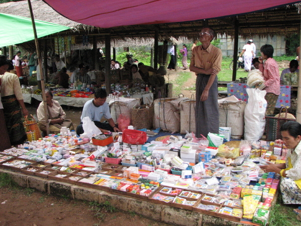Dieser Stand verkauft Medizin. Ich kann nur jedem dringendst raten: bringt eine große Reiseapotheke und werdet bloß nicht krank in Myanmar ;-)