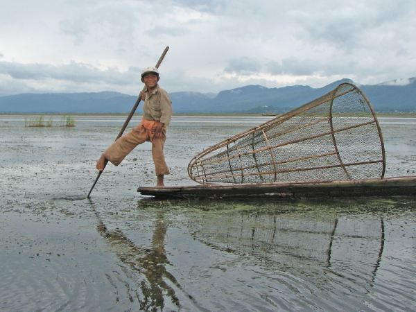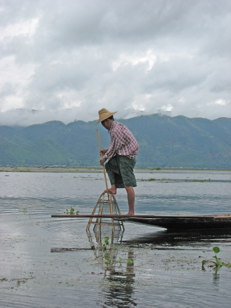 Die Fischer am Inle-See haben eine ganz spezielle Technik entwickelt: mit einem Bein wird gerudert, das andere Bein balanciert auf dem schmalen Boot, so dass sie zumindest einen Arm fürs Fischen frei haben. Das Ganze sieht wirklich akrobatisch aus, scheint aber sehr effizient zu sein ;-)