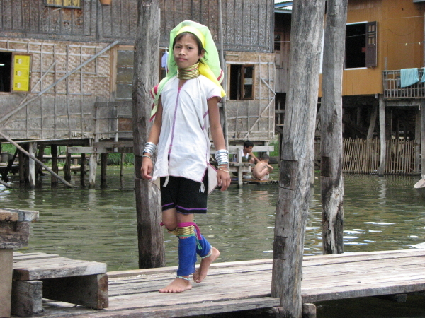 Rund um den Inle-See und hoch in den Bergen gibt es viele verschiedene ethnische Minderheiten. Bei einer dieser Volksgruppen tragen die Frauen schon von Kindesbeinen an goldene Halsreifen. In regelmäßigen Abständen kommt einer dazu und da sich die Halswirbel durch die Dehnung im Laufe der Jahre destabilisieren, dürfen die Reifen auch nicht mehr abgenommen werden.
