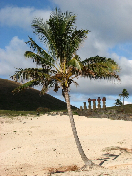 Die Moais bei Anakena stehen direkt am Strand. Sonnenbaden mit Blick auf die